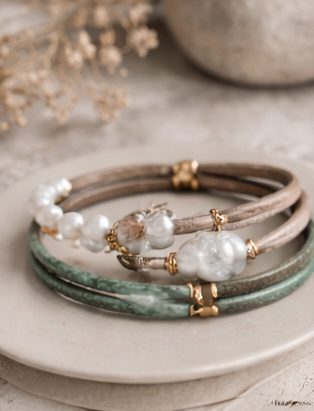 Mitmekihiline käevõru, kus kohtuvad nahk, pärlid ja looduslikud kivid. Täiuslik valik, kui soovid ühes ehtes terviklikku kooslust.
